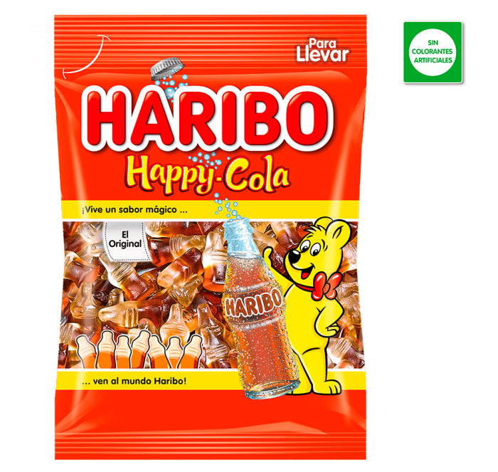 CARAMELOS DE GOMA SABOR COLA / Ingredientes: Jarabe de glucosa; azúcar; agua; gelatina; dextrosa; acidulante: ácido cítrico; aroma; jarabe de caramelo; agentes de recubrimiento: cera de abeja, blanca y amarilla, cera de carnauba. Puede contener trazas de leche, trigo.